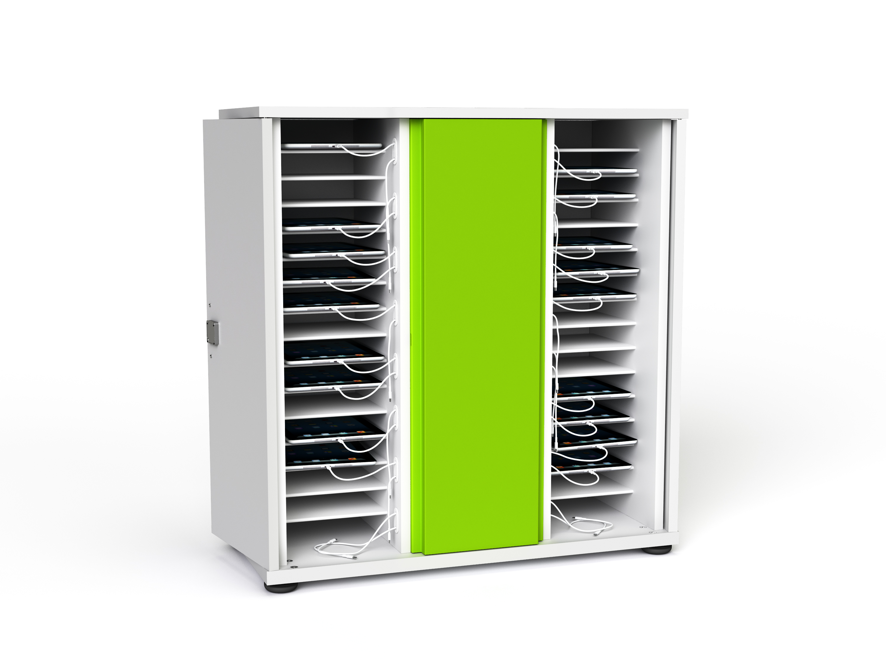 Skåpet rymmer 32 iPads och andra plattor i storlekar upp till ca 11”. De separata hyllornas mått är 310x210x40 mm vilket ger utrymme nog även för större fodral till exempel Griffin Survivor.