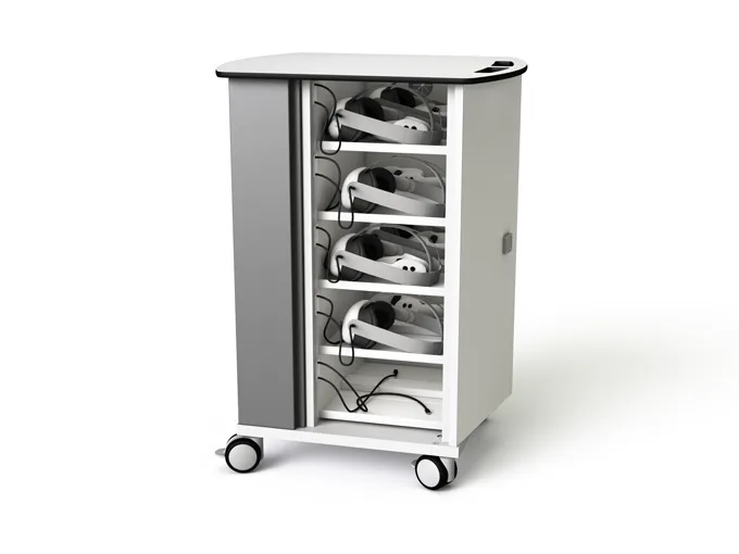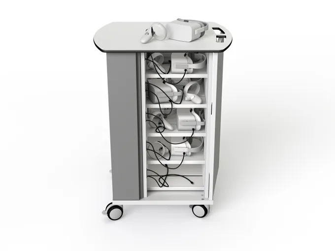 Laddarna förvaras bakom en fastskruvad plåt och endast en kort USB-kabel presenteras vid varje hylla vilket bidrar till en känsla av ordning och reda. Laddvagnen är perfekt för Meta Quest 3S, Meta Quest 3, Oculus Quest 2, Rift and Go-headset och -kontroller. Dörrarna öppnas 270 grader för enkel åtkomst och det finns digitala kodlås eller nyckellås att välja på.