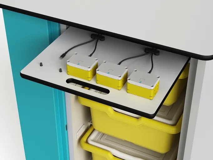Artikelnummer: CHRGUA-LO-4LEGO Spike laddvagn erbjuder förvaring och laddning av 4 st LEGO Spike programmerbara hubbar samt förvaring av 4 Spike Prime förvaringslådor. Den integrerade USB-strömmodulen, som gör att några laddare inte behövs finns i ett separat elektriskt fack bakom den avtagbara blå panelen som är tillgänglig från vagnens framsida. De medföljande USB strömkablarna är fördragna.