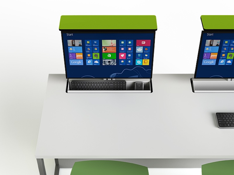 Tryck ner toppen och datorskärmen, tangentbordet och musen stiger graciöst upp ut bordets inre, vilket omvandlar till synes vanliga bord till datorarbetsplatser med gott om arbetsyta framför. Tryck ner igen för att dölja monitorn i bordet.
